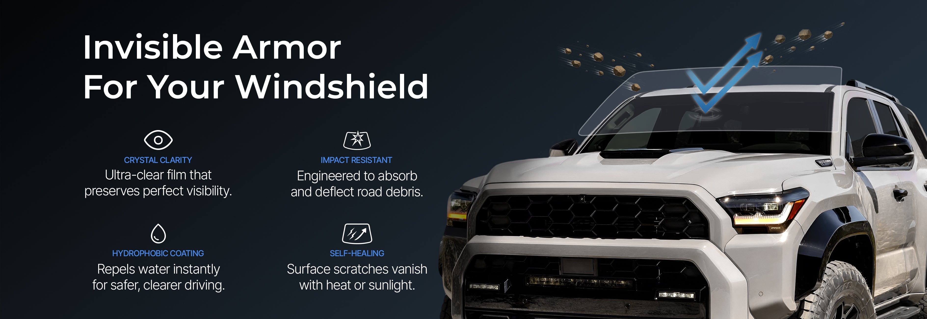 TANK (Windshield Protection Film) is a clear, impact-resistant film thatβs applied directly to your windshield. It takes the hit from road debris, rock chips, and pitting so your glass doesnβt have to. It keeps your windshield protected and your view clear on every drive.